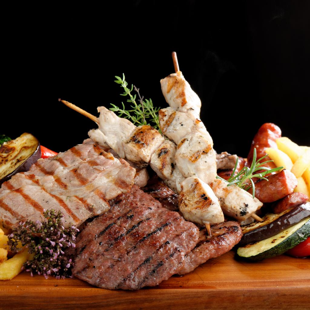 Wallpaper Grilled meat on a board with vegetables