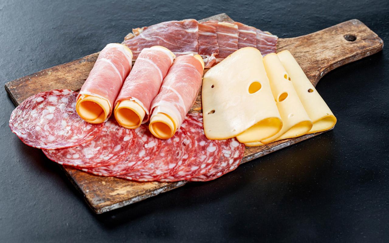 Wallpaper Pieces of cheese, ham and sausage on a board