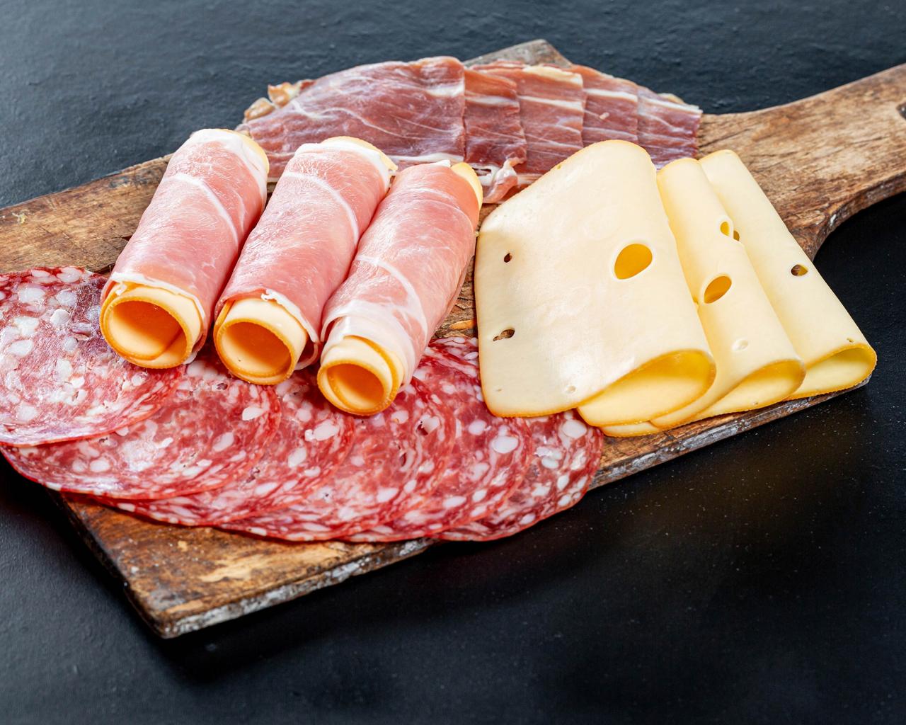 Wallpaper Pieces of cheese, ham and sausage on a board
