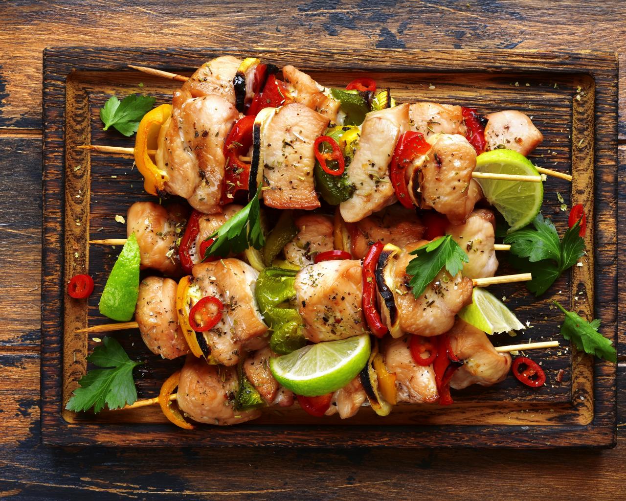 Wallpaper Delicious chicken skewers with vegetables on skewers.