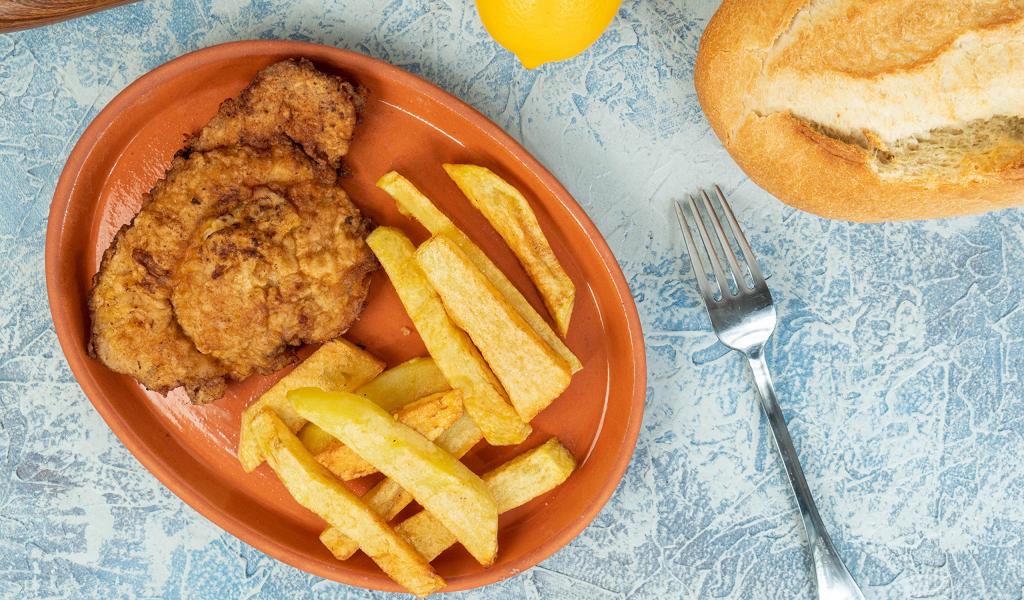 Wallpaper Appetizing chop on a plate with french fries and salad