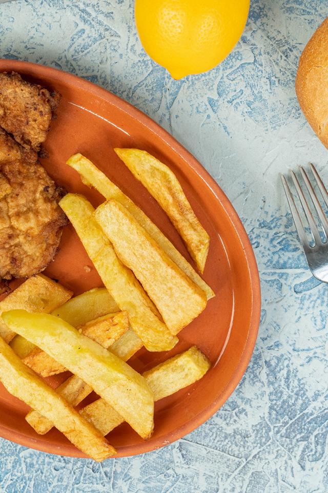 Wallpaper Appetizing chop on a plate with french fries and salad
