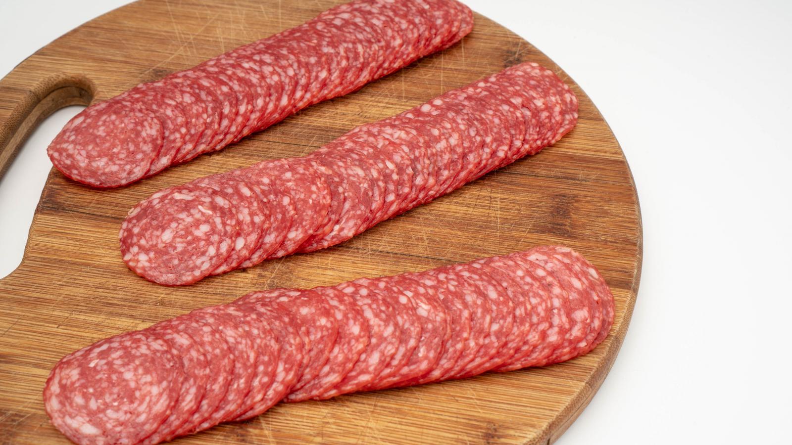 Wallpaper Sausage thinly sliced on a cutting board
