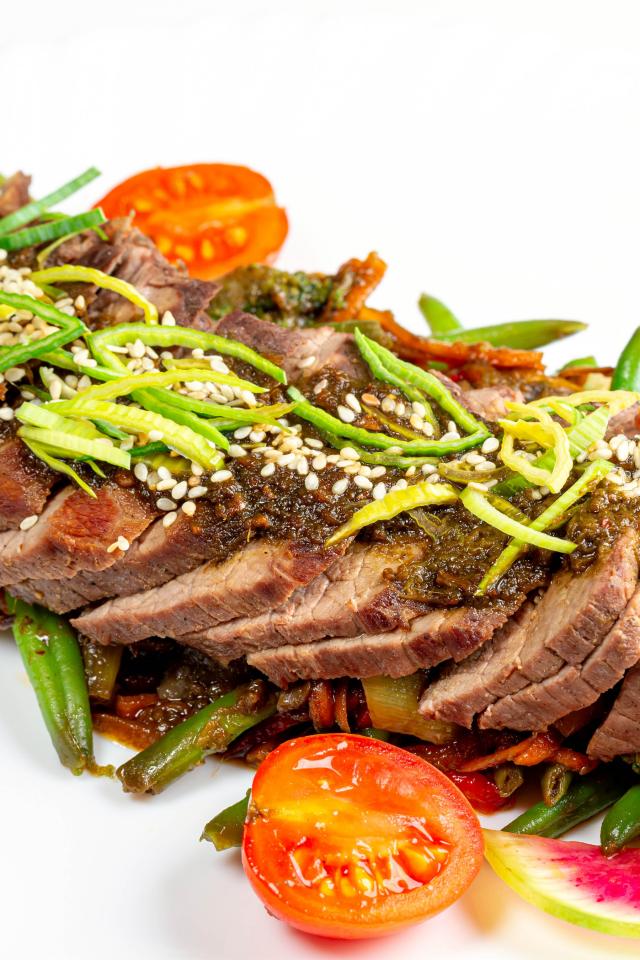 Wallpaper Sliced meat on a white plate with vegetables