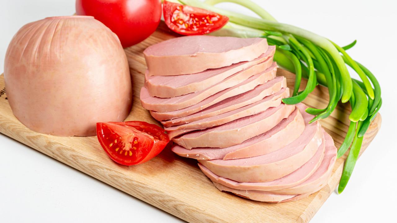 Wallpaper Boiled sausage on a board with onion and tomato