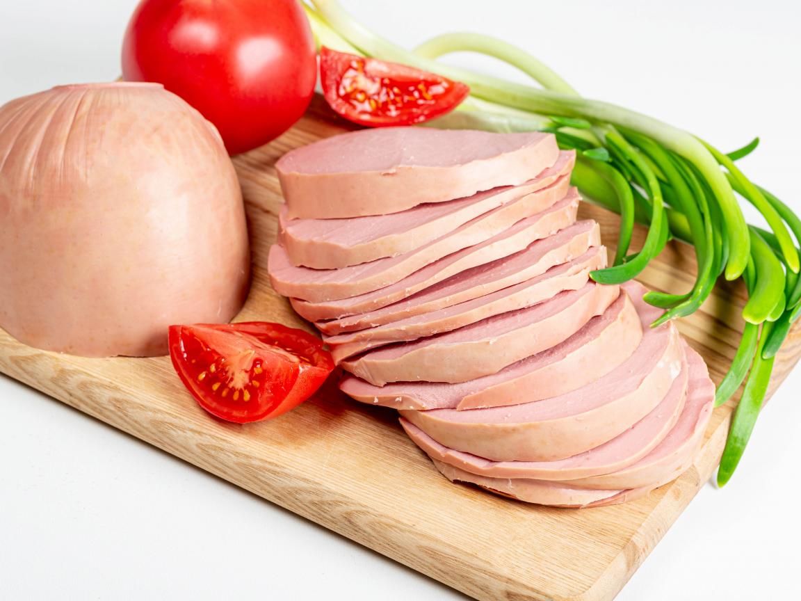 Wallpaper Boiled sausage on a board with onion and tomato