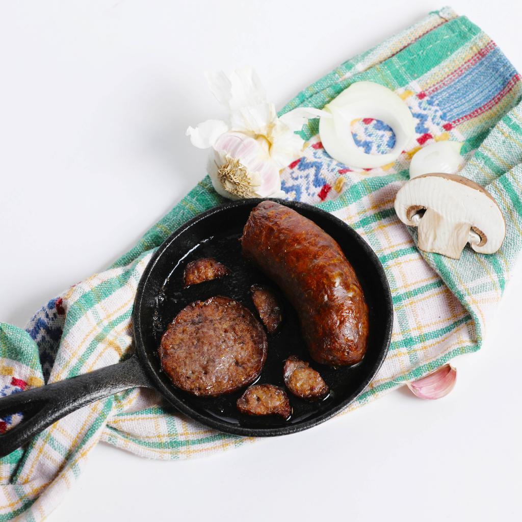 Wallpaper Fried sausage pan on a table with a towel and garlic