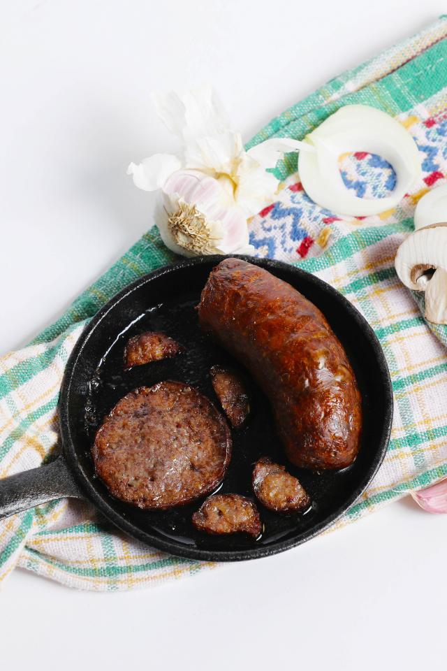 Wallpaper Fried sausage pan on a table with a towel and garlic