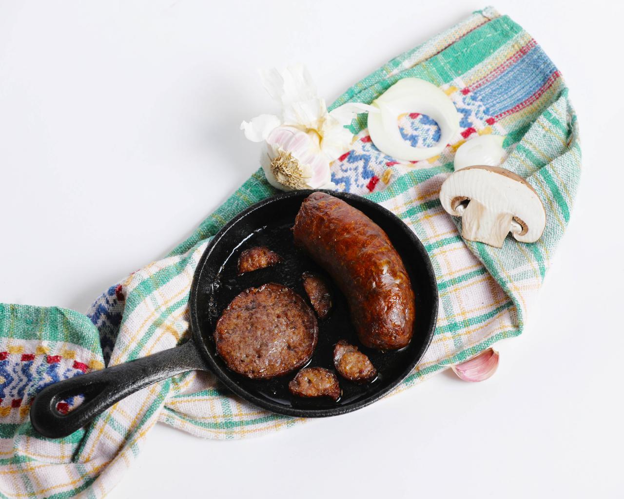 Wallpaper Fried sausage pan on a table with a towel and garlic
