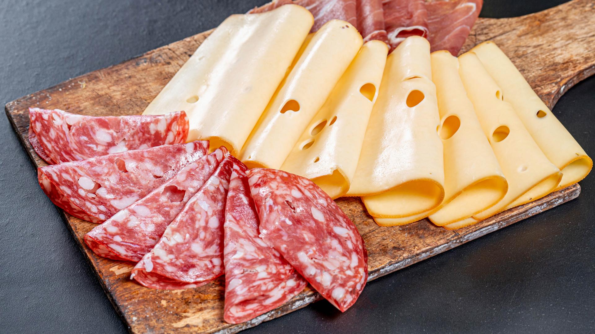 Wallpaper Sausage, meat and cheese sliced on a cutting board