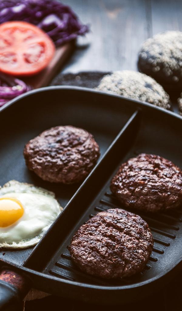 Wallpaper Three cutlets in a skillet with scrambled eggs
