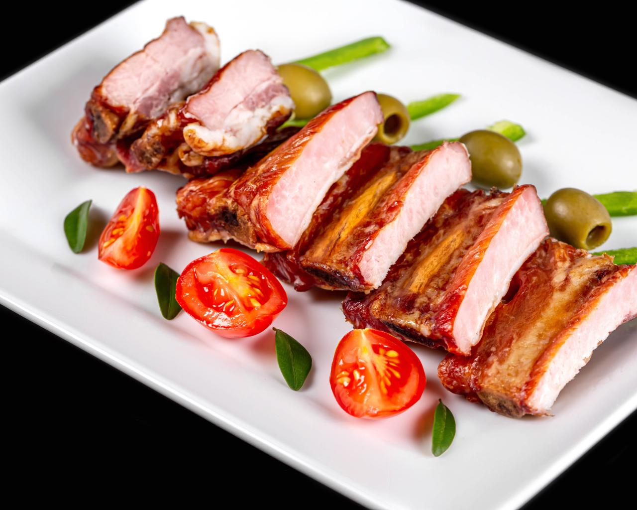 Wallpaper Baked ribs on a white plate with tomatoes and olives