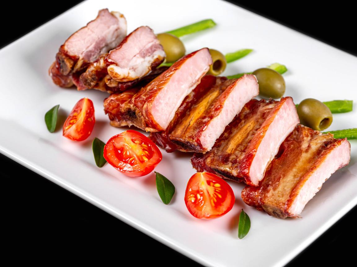 Wallpaper Baked ribs on a white plate with tomatoes and olives