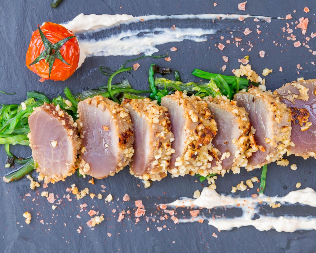 Wallpaper Cured meat on the table with herbs and tomato