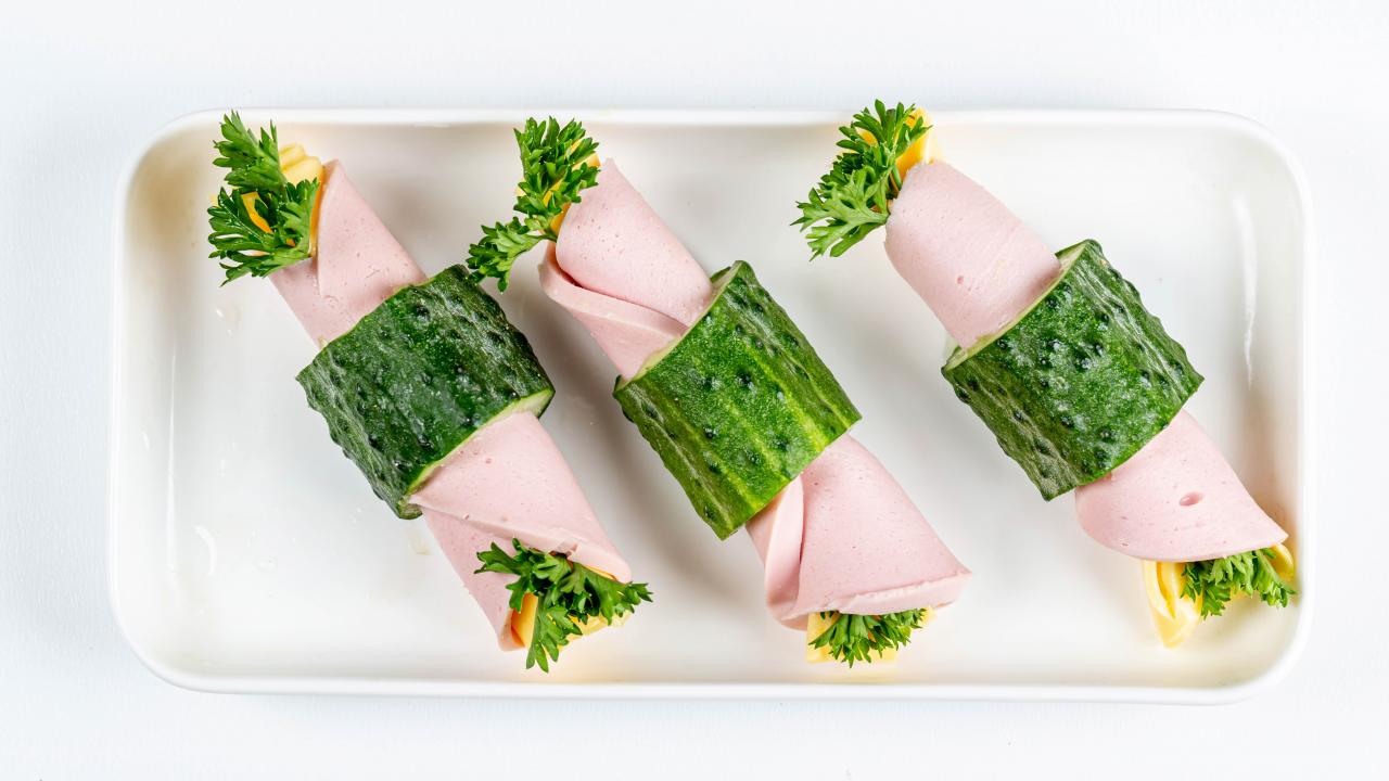 Wallpaper Boiled sausage rolls with cheese in cucumbers