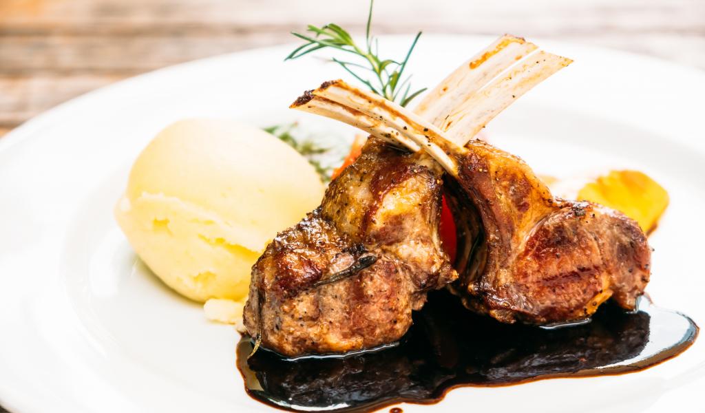 Wallpaper Appetizing pork ribs with mashed potatoes on a plate