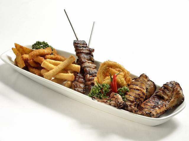 Wallpaper BBQ meat on a plate with seafood in batter