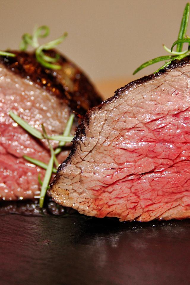 Wallpaper A piece of baked meat with blood on the table