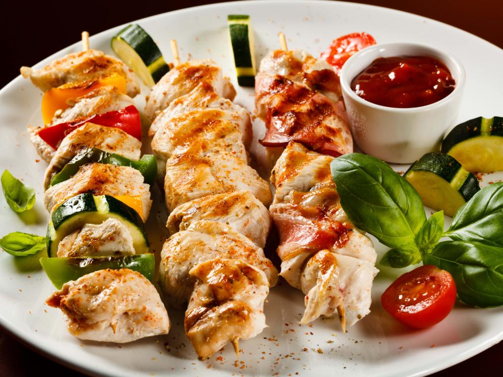 Wallpaper Appetizing chicken kebab with zucchini on a plate