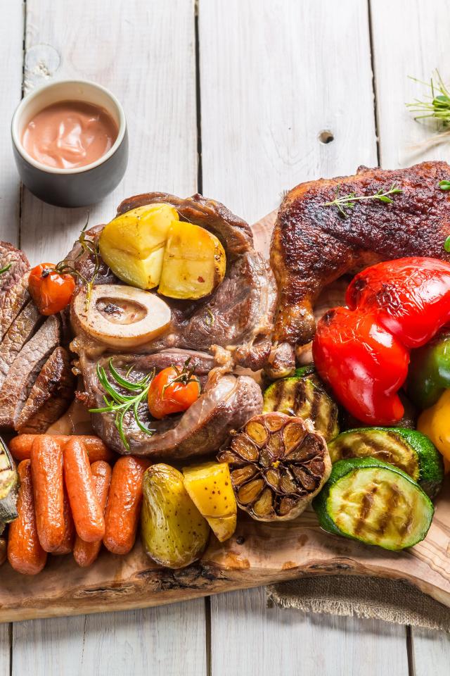 Wallpaper Pieces of baked meat on a board with vegetables