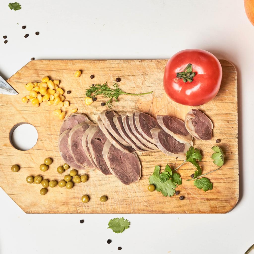 Wallpaper Sliced tongue with green peas on a board