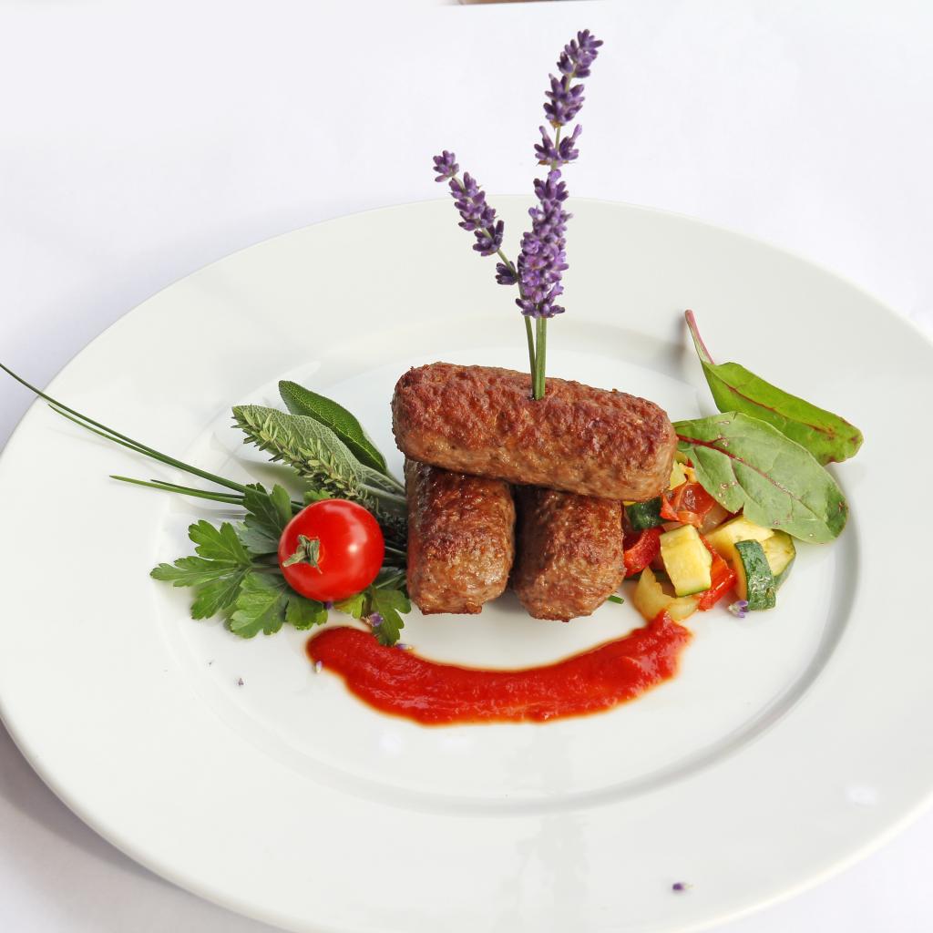Wallpaper Meat sticks on a plate with herbs and sauce