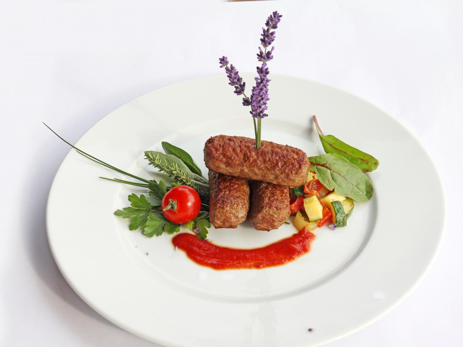 Wallpaper Meat sticks on a plate with herbs and sauce