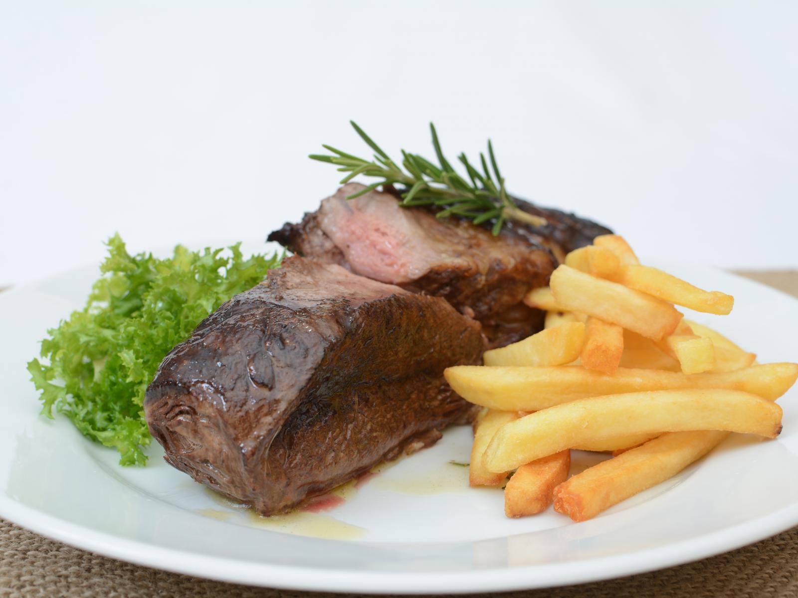 Wallpaper Two pieces of meat on a plate with fries