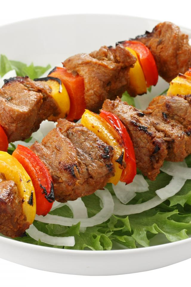 Wallpaper Shish kebab with bell pepper on a plate with lettuce