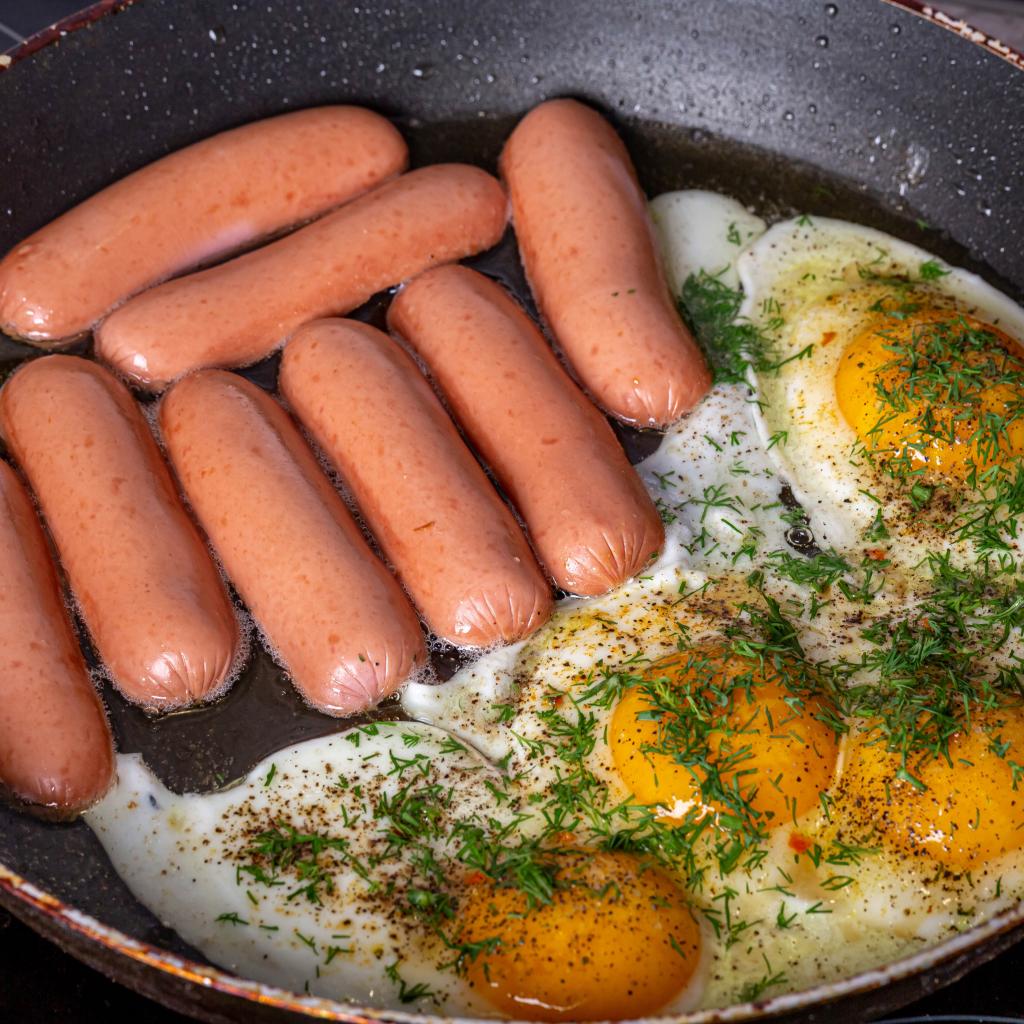 Wallpaper Sausages with scrambled eggs in a pan