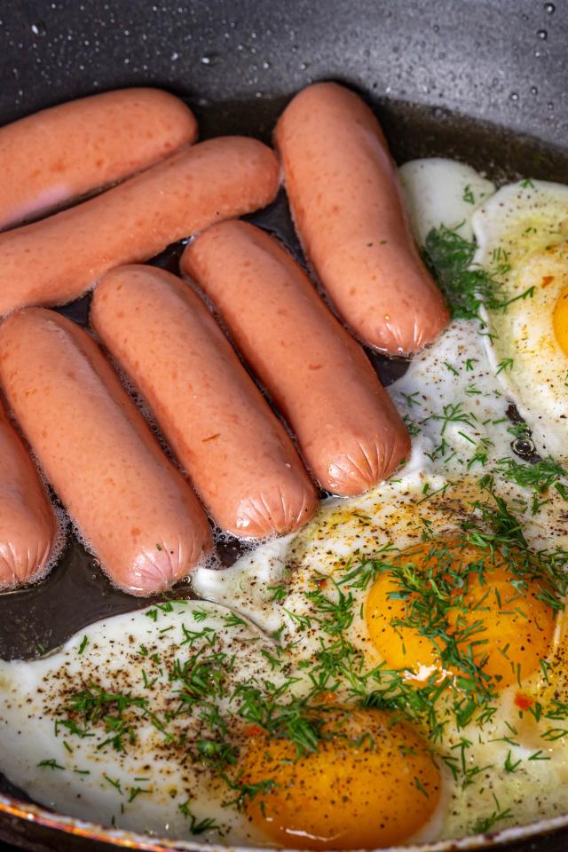 Wallpaper Sausages with scrambled eggs in a pan