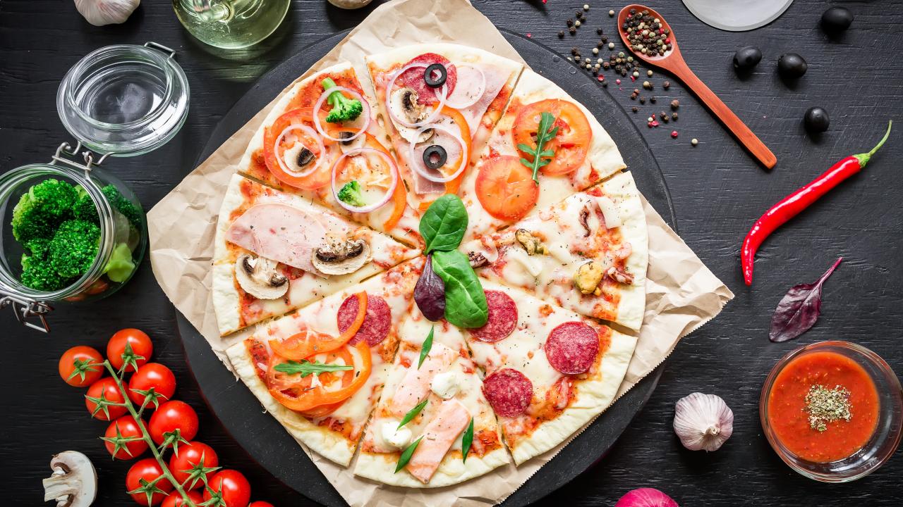 Wallpaper Appetizing pizza on a table with spices and tomatoes