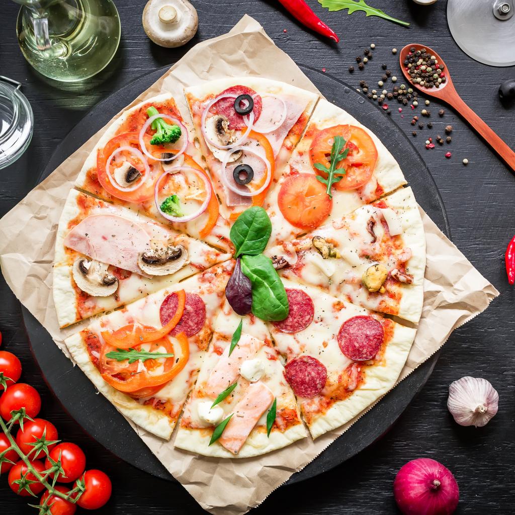 Wallpaper Appetizing pizza on a table with spices and tomatoes