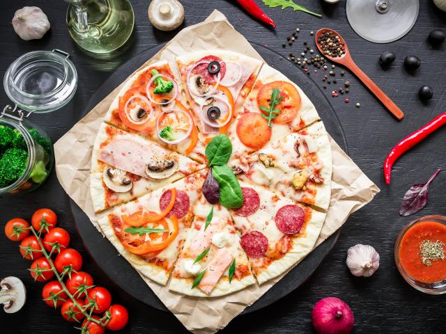Wallpaper Appetizing pizza on a table with spices and tomatoes