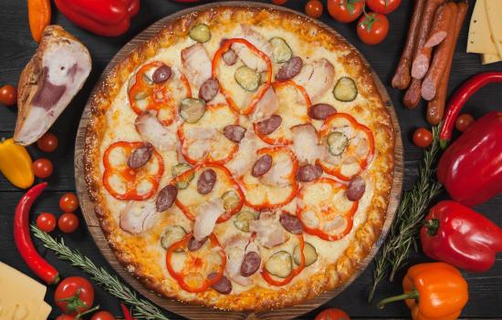 Wallpaper Pizza with sweet pepper, pickled cucumbers and sausages