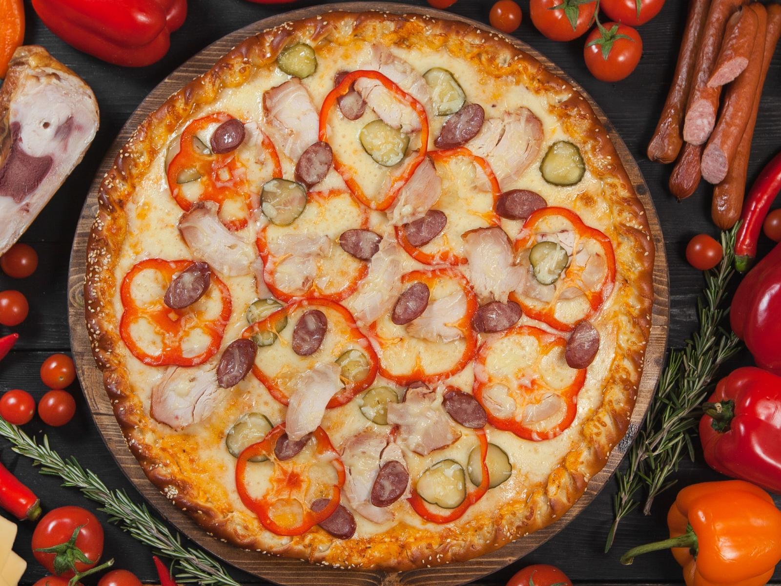 Wallpaper Pizza with sweet pepper, pickled cucumbers and sausages