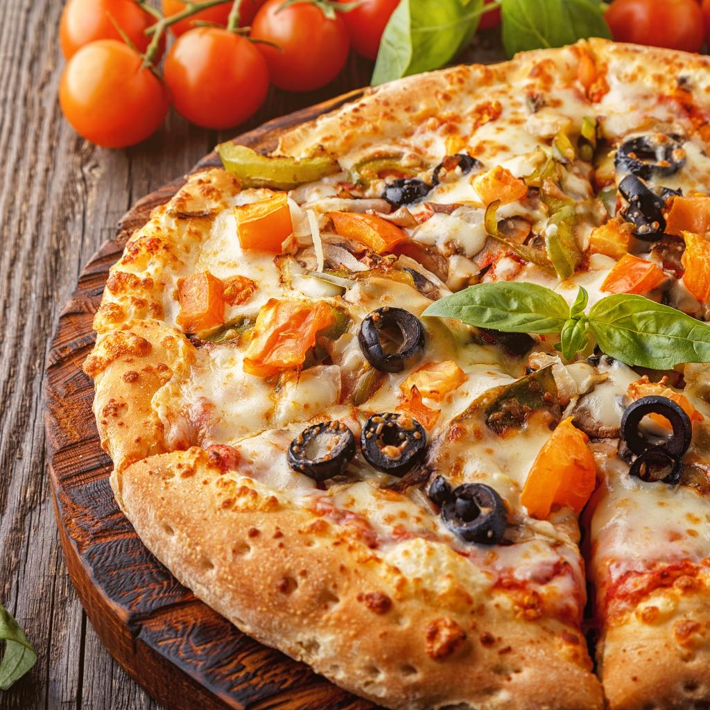 Wallpaper Appetizing pizza with olives on the table