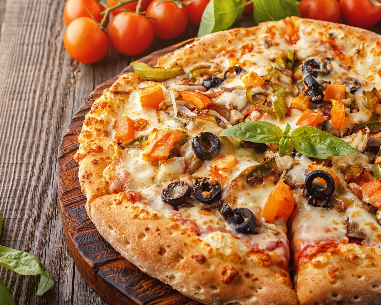 Wallpaper Appetizing pizza with olives on the table
