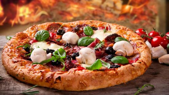 Wallpaper Appetizing pizza with sausage, bacon and mushrooms