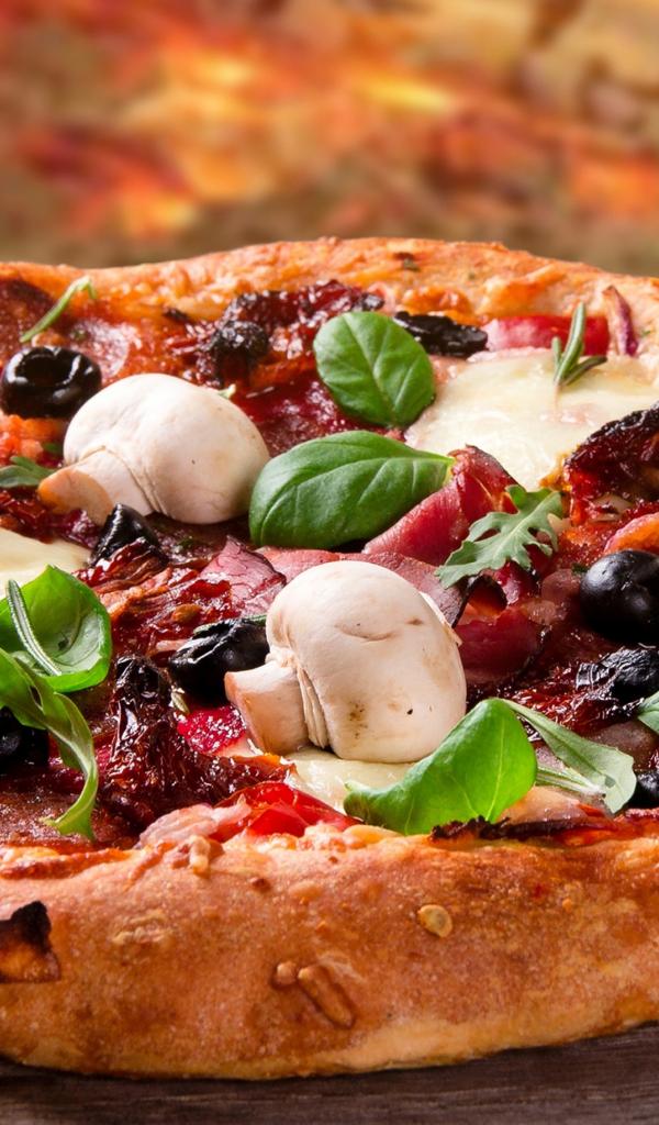 Wallpaper Appetizing pizza with sausage, bacon and mushrooms