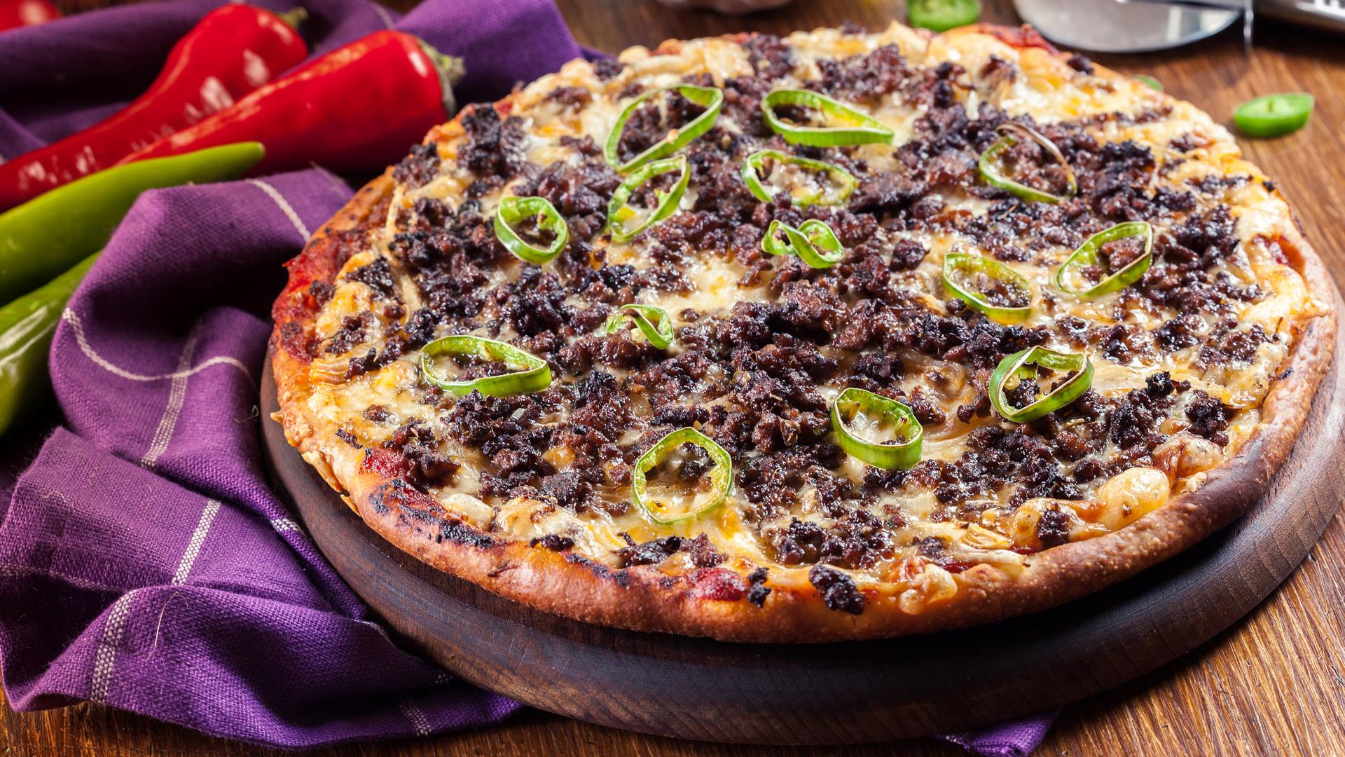 Wallpaper Pizza on the board with meat and pepper