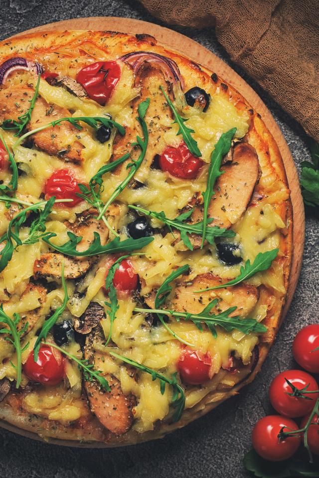 Wallpaper Pizza with tomatoes, cheese, meat and arugula