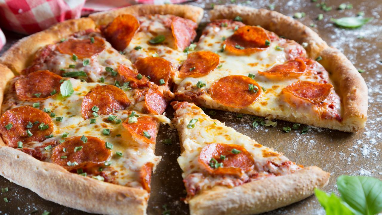 Wallpaper Appetizing pizza with slices of sausage and cheese