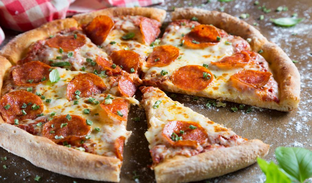 Wallpaper Appetizing pizza with slices of sausage and cheese