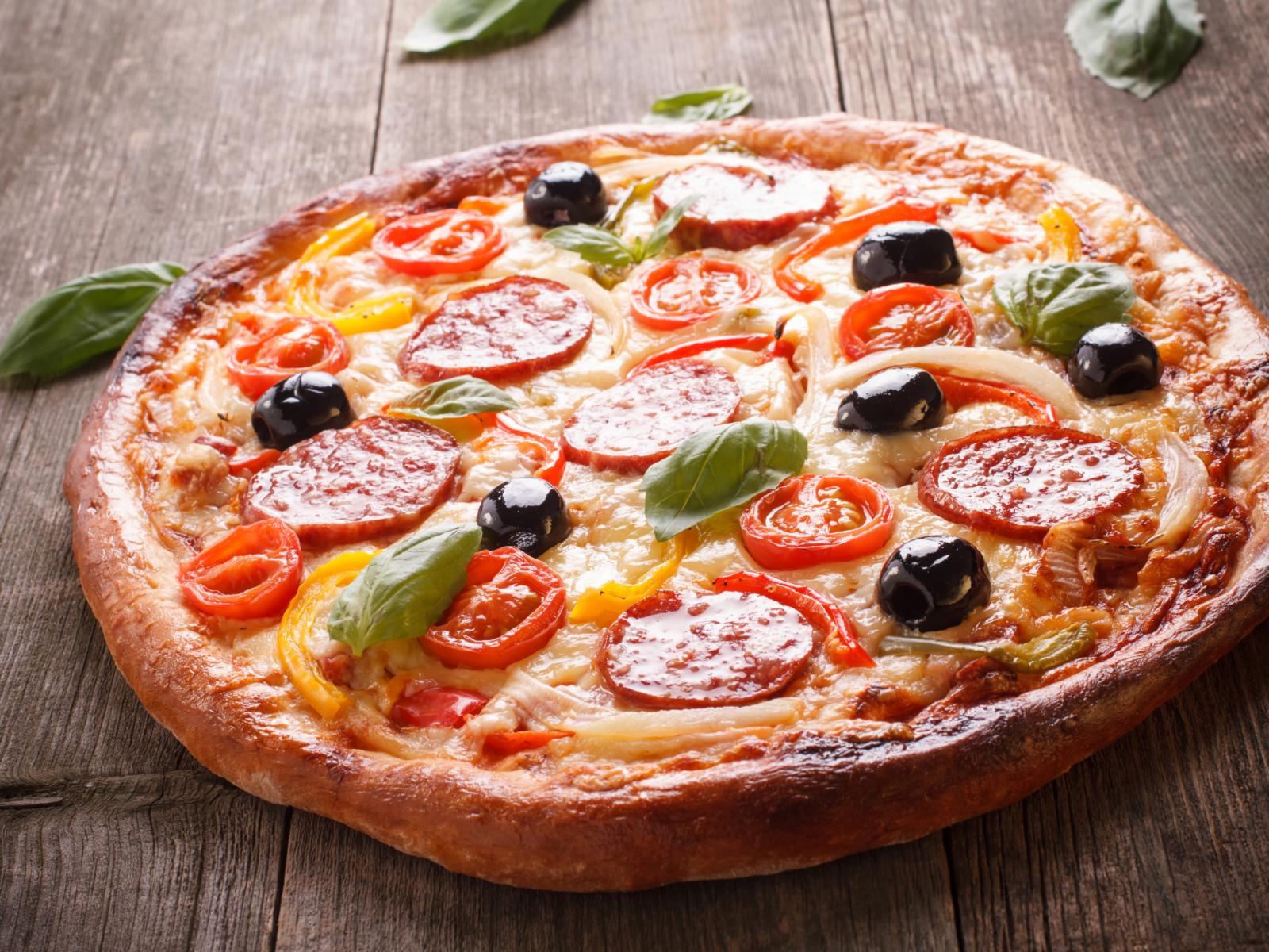 Wallpaper Rosy pizza with sausage, tomatoes, olives and cheese