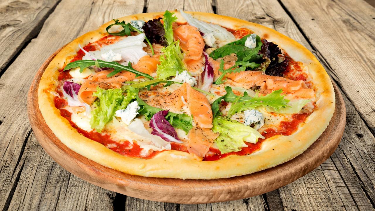 Wallpaper Appetizing pizza with fish and arugula