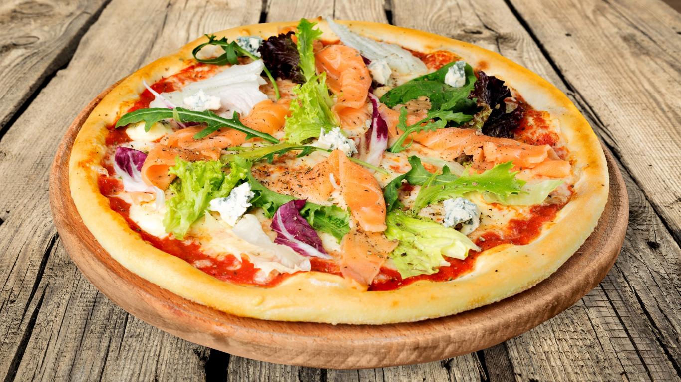 Wallpaper Appetizing pizza with fish and arugula