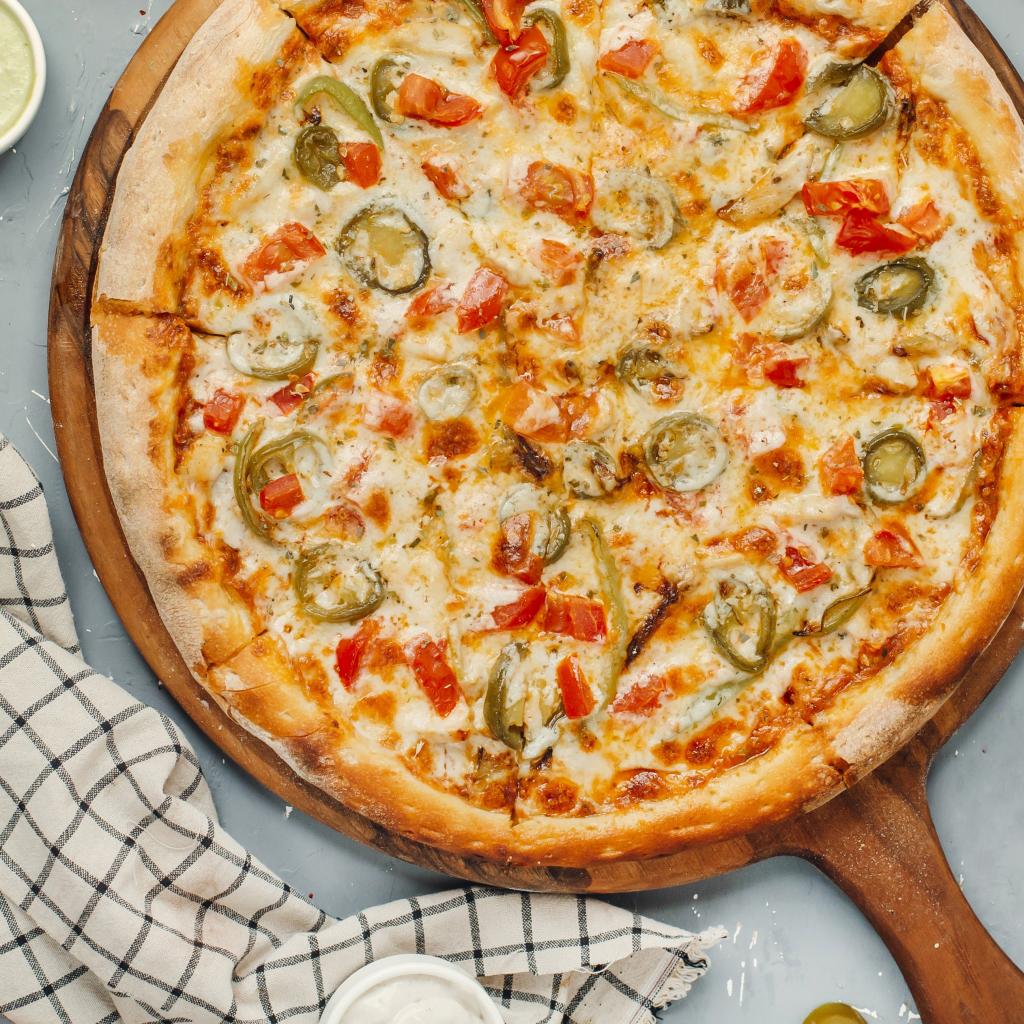 Wallpaper Appetizing pizza with vegetables and cheese on the board