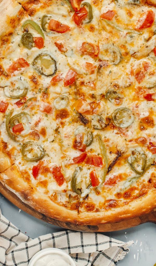 Wallpaper Appetizing pizza with vegetables and cheese on the board
