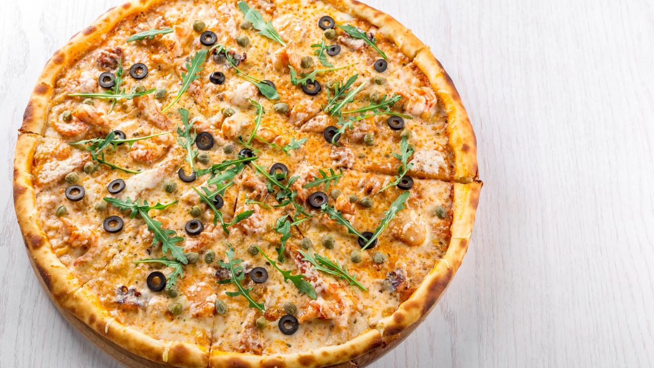 Wallpaper Pizza with seafood, arugula and olives on the table